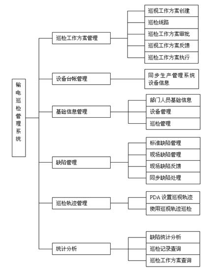 系統功能主要包括:輸電工作方案管理、輸電巡視卡管理、缺陷管理、巡視設置管理、查詢統計、PDA現場巡視管理、系統管理、同步對接數據管理,如下圖所示: